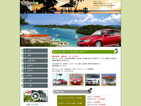 石垣島の北西部(山原地区)にある貸別荘に併設したレンタカーで、貸別荘の一棟貨し料金(1泊12000円)に、レンタカー代も入っている。4人まで宿泊可能で、長期滞在には割引もある。