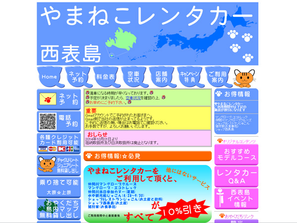 なお、西表島には絶滅危惧種のイリオモテヤマネコが交通事故にあって死亡すケースも増えており、レンタカー利用者にはスピードを出さないように呼びかけている。